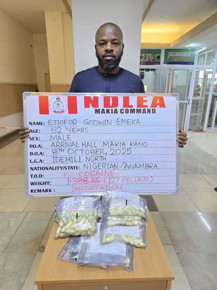 A 52-year-old businessman Ejiofor Emeka has been arrested by operatives of the National Drug Law Enforcement Agency (NDLEA) at the Mallam Aminu Kano International Airport (MAKIA) Kano following which a total of 127 wraps of cocaine concealed in his private part and stomach have been recovered after days under excretion observation.