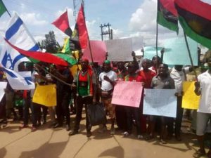 Reports reaching 9news Nigeria news desk have it that IPOB are currently protesting in Aba over the abduction of its leader Mazi Nnamdi Kanu and his parents; the extra judicial killings of its members, illegal detention of Biafrans and a call for referendum.