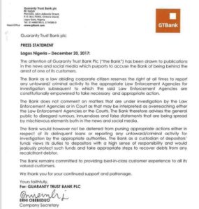 Breaking NewsHot NewsPolitics BREAKING!! GTB Releases Official Statement On Innoson And EFCC Last updated: December 21, 2017 9:29 pm By Wisdom Nwedene Share 0 Min Read SHARE This is a press release by GT Bank regarding the on going saga between EFCC, Chairman of IVM and the Bank. Wisdom Nwedene See Full Bio Share This Article Facebook Whatsapp Whatsapp Copy Link Previous Article Tithing: Daddy Freeze Replies Veteran Actor Turned Pastor, Zack Orji Next Article We Have Paid December & 13th-Month Salaries To Workers – Ogun Search Search for: – Advertisement – Latest News Calls for INEC Chairman resignation grow as hidden facts about Amupitan bias emerge April 15, 2026 YAYI Youth Vanguard Hails Senator Adeola’s Emergence as APC Flag bearer April 15, 2026 BREAKING!!! Court Orders ADC To Stop National Convention, Maintain Status Quo April 14, 2026 Akpabio Declares Support For INEC Chairman Over Alleged Past Social Media Posts April 14, 2026 Imo Majority Leader Onyemaechi, Now “Leader Of The House” IMHA April 14, 2026 OOF Expands Impact, Trains Farmers in Imo April 14, 2026 How ADC daily growing population in the North will affect all elections… the northern arithmetics to victory April 14, 2026 Adamawa ADC faction suspends Atiku, Babachir Lawal, others April 13, 2026 ORGAN HARVESTING: Chief Morocco Denies Involvement, Faults All Allegations April 13, 2026 Another Commanding Officer Falls in Borno April 13, 2026 – Advertisement – 9News NigeriaWorld News News CategoriesEntertainment and Lifestyle