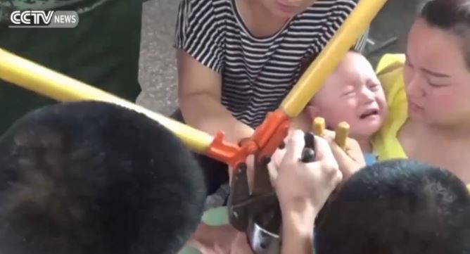 China: A one-year-old boy in Suzhou, in east China’s Anhui Province, found himself in a sticky situation after his right thumb got stuck in a steel Silverware holder.