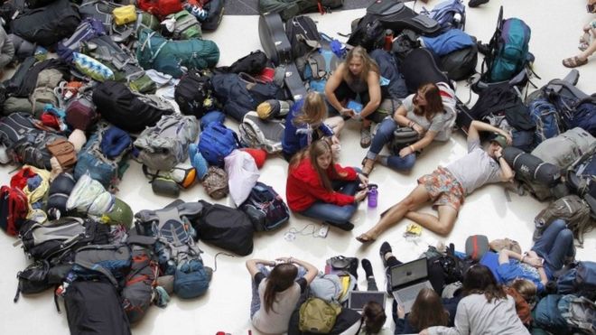 Passengers around the world complained of long check-in queues, with many sleeping on the floor.