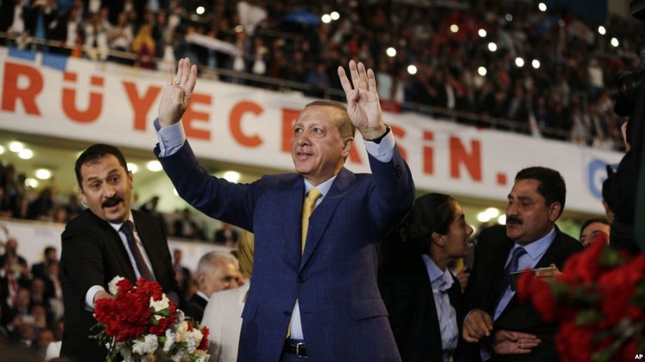 Erdogan spoke Sunday in Ankara to tens of thousands of his followers and members of his ruling (AK) Justice and Development Party, which convened to re-elect their party co-founder to the post.