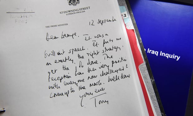 Over the preceding months the two leaders had an intimate working relationship, the letters show. In September 2002, Blair scrawled Bush a handwritten note praising a “brilliant speech” that “puts on exactly the right strategy to get the job done”. He signed off: “Well done. Yours ever, Tony”.