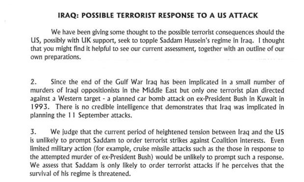 But he then set out a recipe for providing evidence against Iraq. “If we recapitulate all the WMD evidence; add his attempt to secure nuclear capability; and, as seems possible, add an al-Qaida link, it will be hugely persuasive over here. Plus, of course, the abhorrent nature of the regime.”