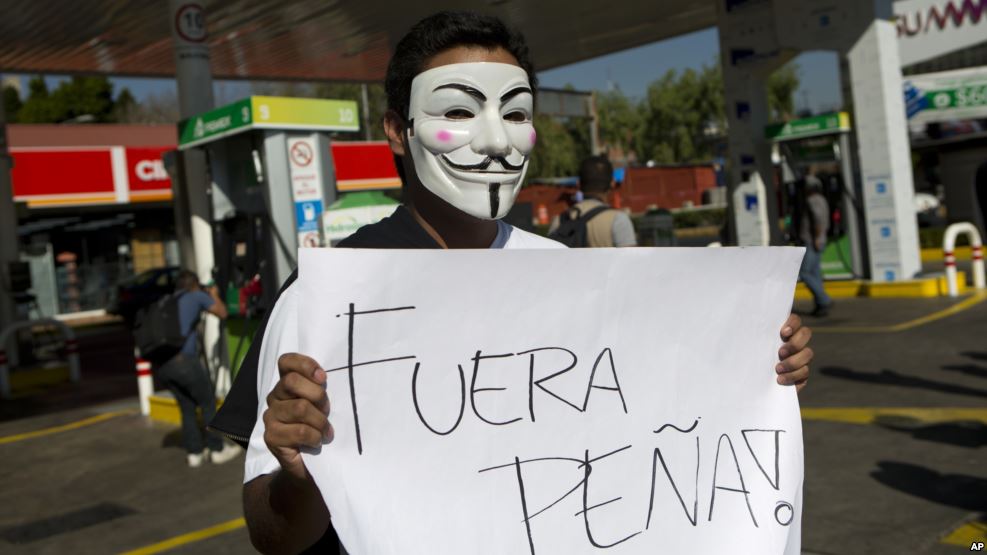 People hold signs reading “Pena out,” and “No more gasoline price hikes” as they protest in front of the National Palace in Mexico City, Jan. 1, 2017.