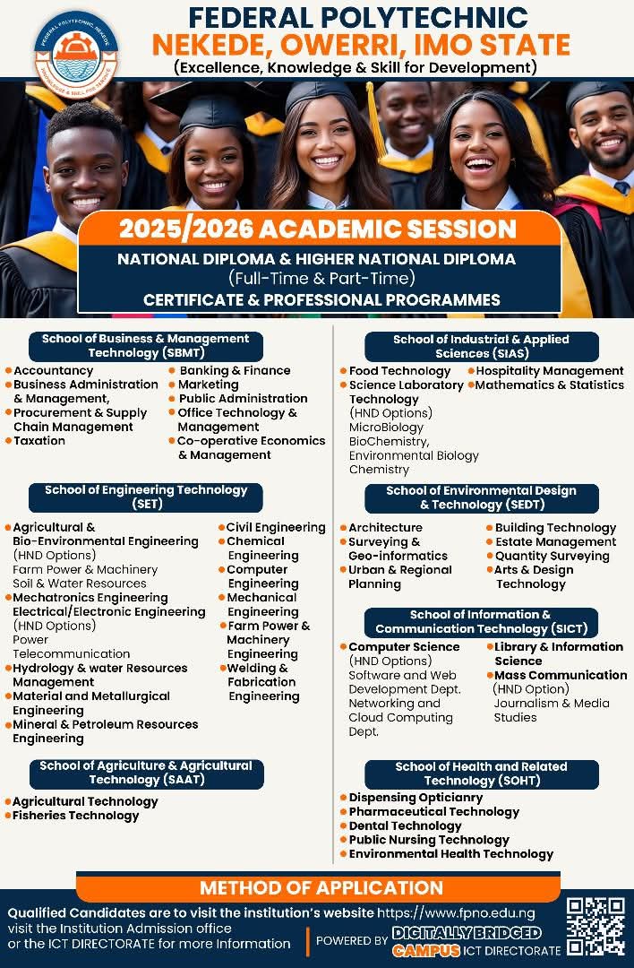 The management of the most prestigious Polytechnic in Nigeria, Federal Polytechnic Nekede,Owerri led by Dr. Basilia Nkem Igbokwe as the Rector, has announced the released of first, second and third batches of admissions for 2025/2026 academic session.