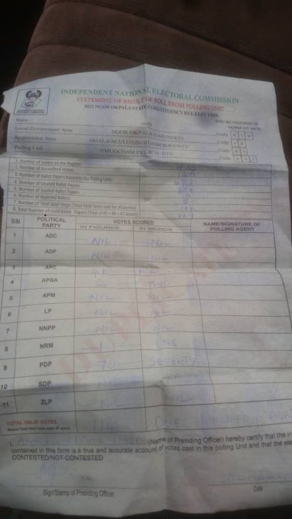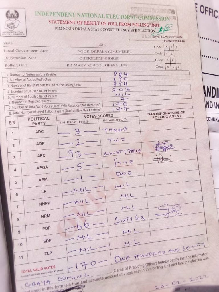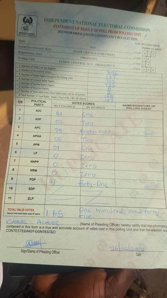 The All Progressives Congress (APC) in Imo State is leading across polling units based on results released so far.