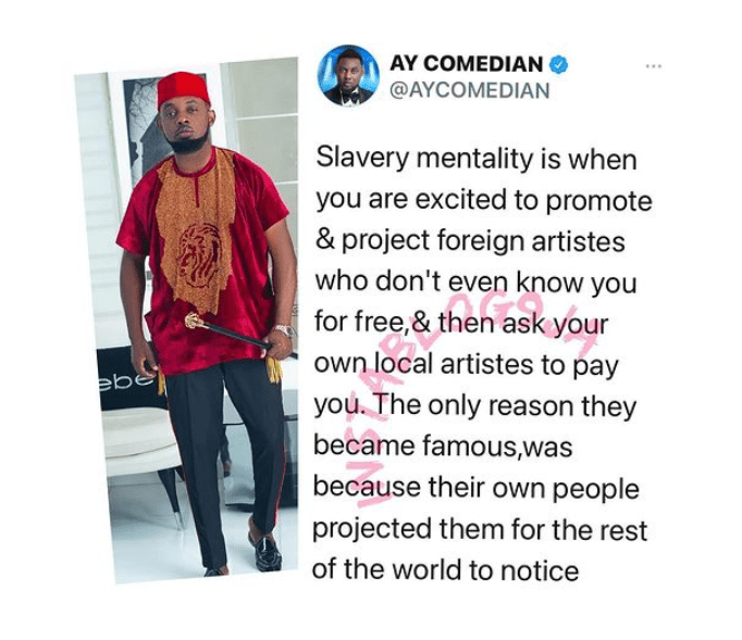 Ayodeji Richard Makun popularly known as AY has come to Instagram to preach against Nigerian artists who promotes foreign artist for free who don’t know them but can’t promote Nigerian artists without charges., According to some fans that bashed him, they said Ay don’t practice what he preaches…