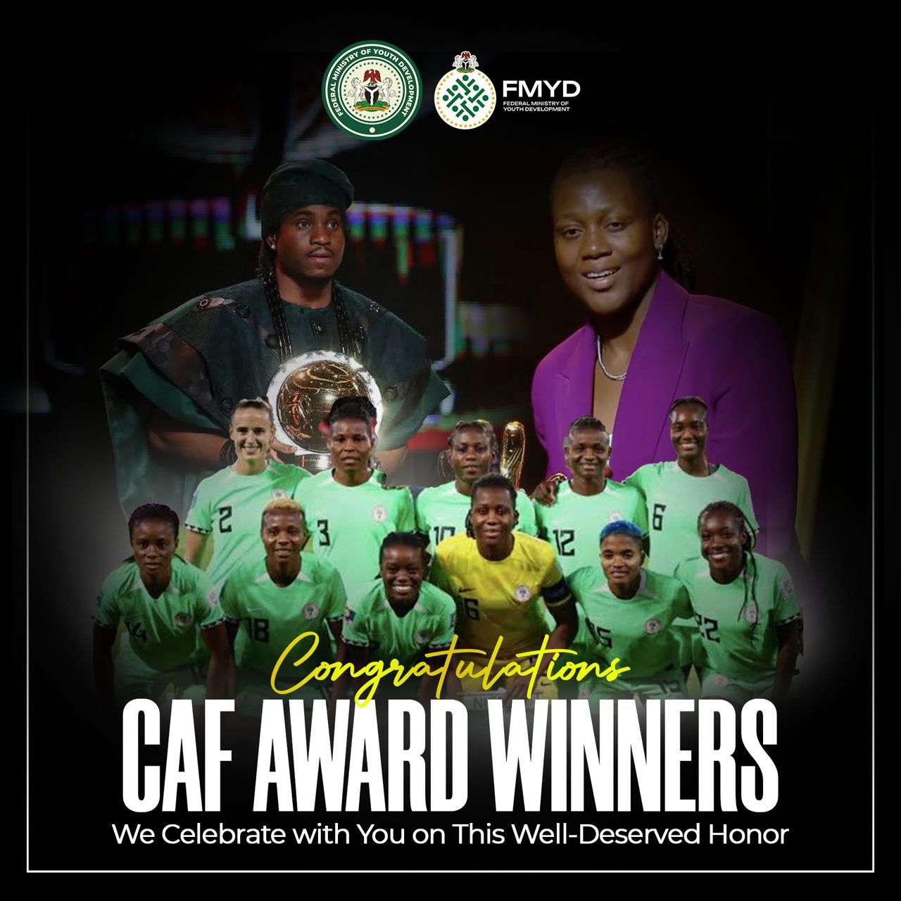Minister for Youth Development, Comrade Ayodele Olawande, has congratulated Ademola Lookman, Chiamaka Nnadozie, and the Super Falcons for their outstanding achievements in winning the CAF Player of the Year (Men), Goalkeeper of the Year (Women), and Female Team of the Year, respectively.