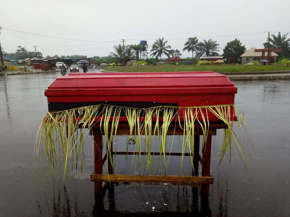 The youths defied the heavy downpour and barricaded the gates of the company at its Housing Estate in Eket and the Airstrip with coffins and other traditional injunctions.