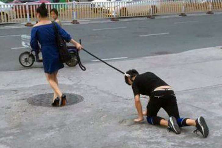 The bizarre sadomasochist act saw the woman – resplendent in a blue skirt and high heels – yanking her ‘dog’ through the busy streets.