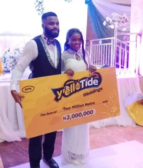 MTN Nigeria on Friday in Onitsha, Anambra, gifted a newlywed couple the sum of two million naira during their wedding, as part of its Y’elloTide Season of Surprises campaign.